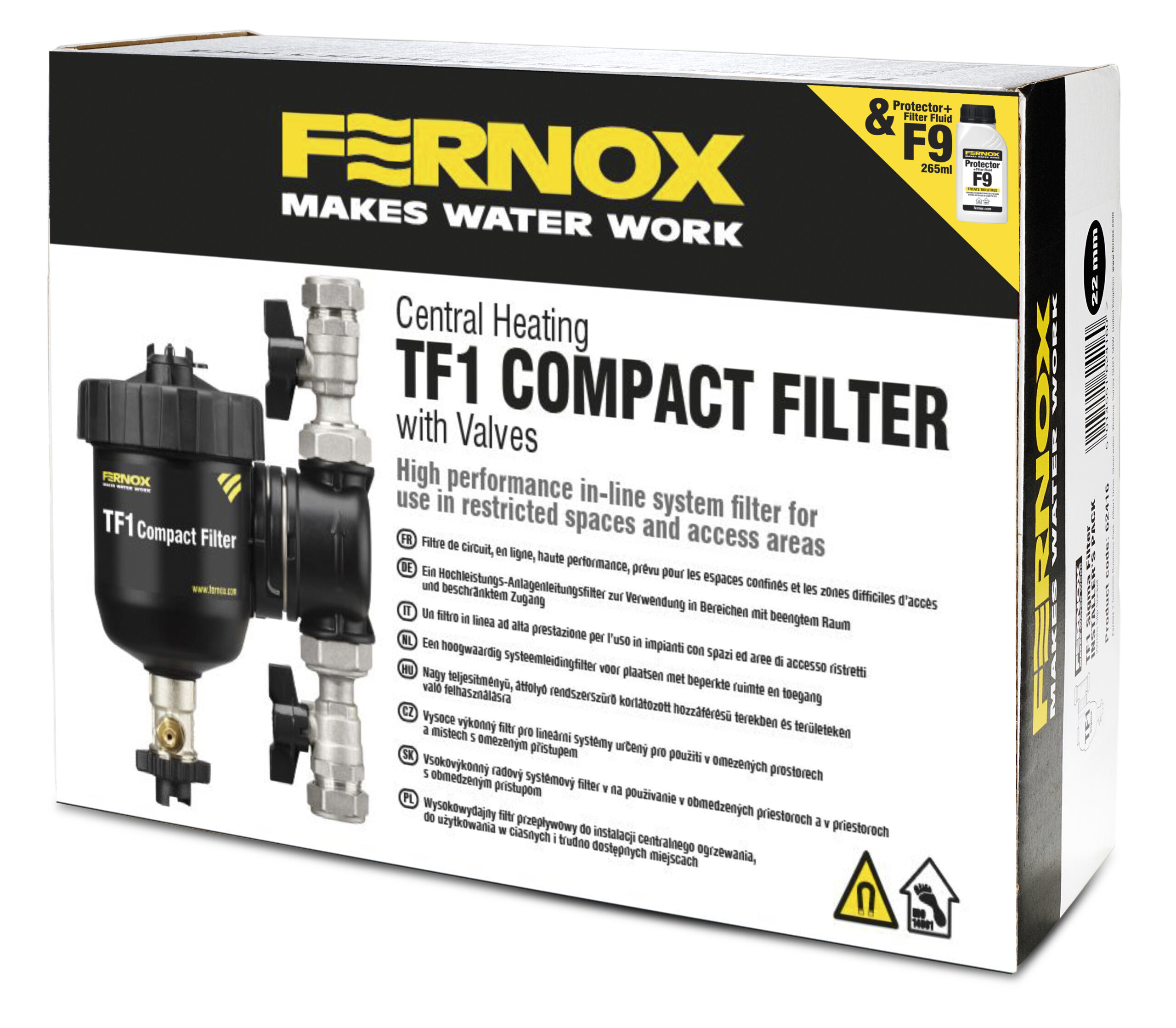 En højtydende, magnetisk in-line systemfilter, TF1 Compact Filter er ideel til små og trange rum. Dette letinstallerede kompositplastfilter kan monteres på både lodrette og vandrette rør i flere positioner. Dets design muliggør opsamling af både magnetiske og ikke-magnetiske partikler ved hjælp af hydrocyklonisk virkning og specialdesignede magnetsamlinger, som opfanger og fastholder snavs inde i filteret inden sikker fjernelse. Hurtig og rodfri rengøring via aftapningsventilen på under 2 minutter – ingen demontering af enheden er nødvendig. Leveres med et forbedret inhibitorprodukt – Protector+ Filter Fluid F9 265 ml – som indeholder dispergeringsmiddel for at maksimere filterets effektivitet i opsamlingen af snavs. Det komplementære samspil mellem kemikalie og filter giver den ultimative beskyttelse af kedel og varmesystem.